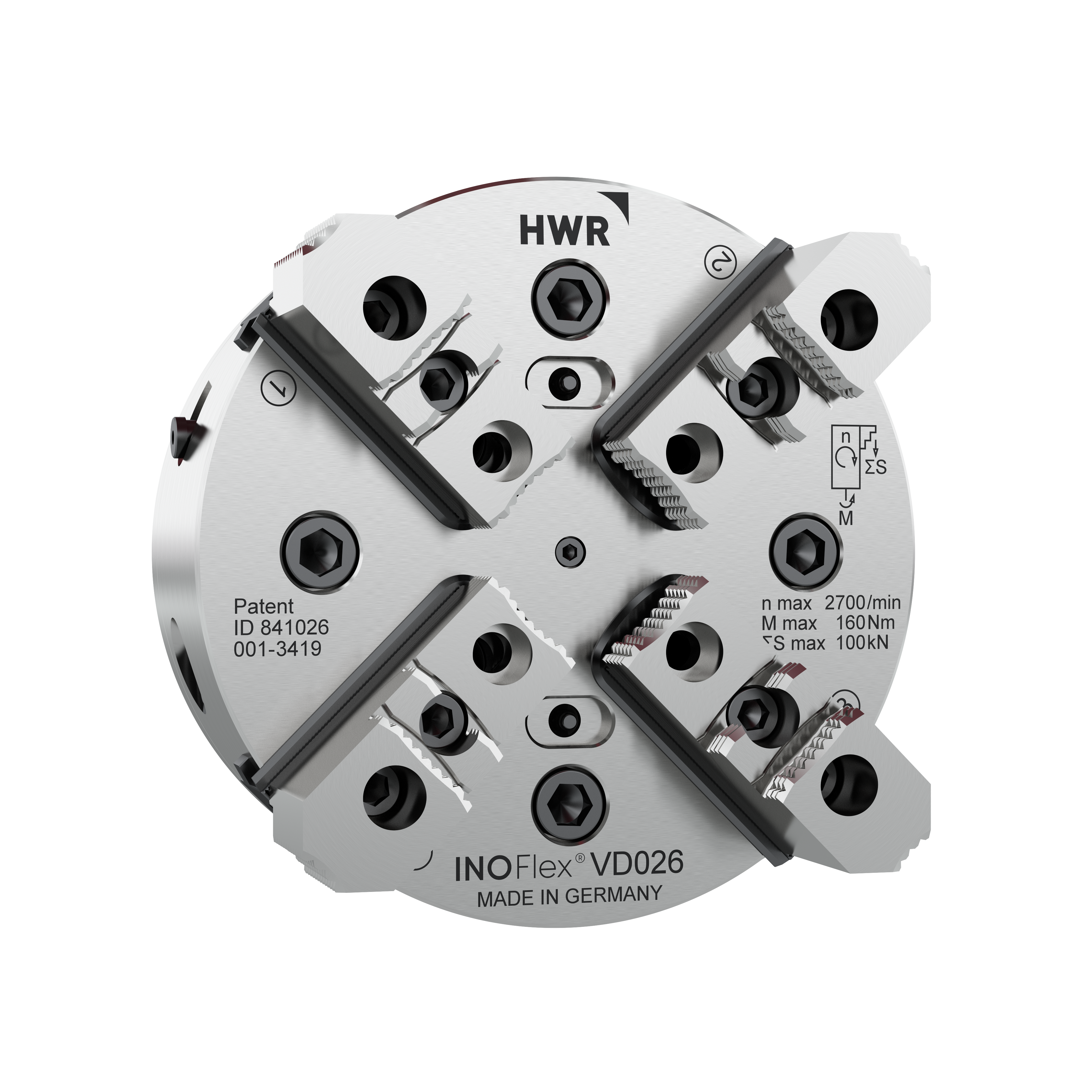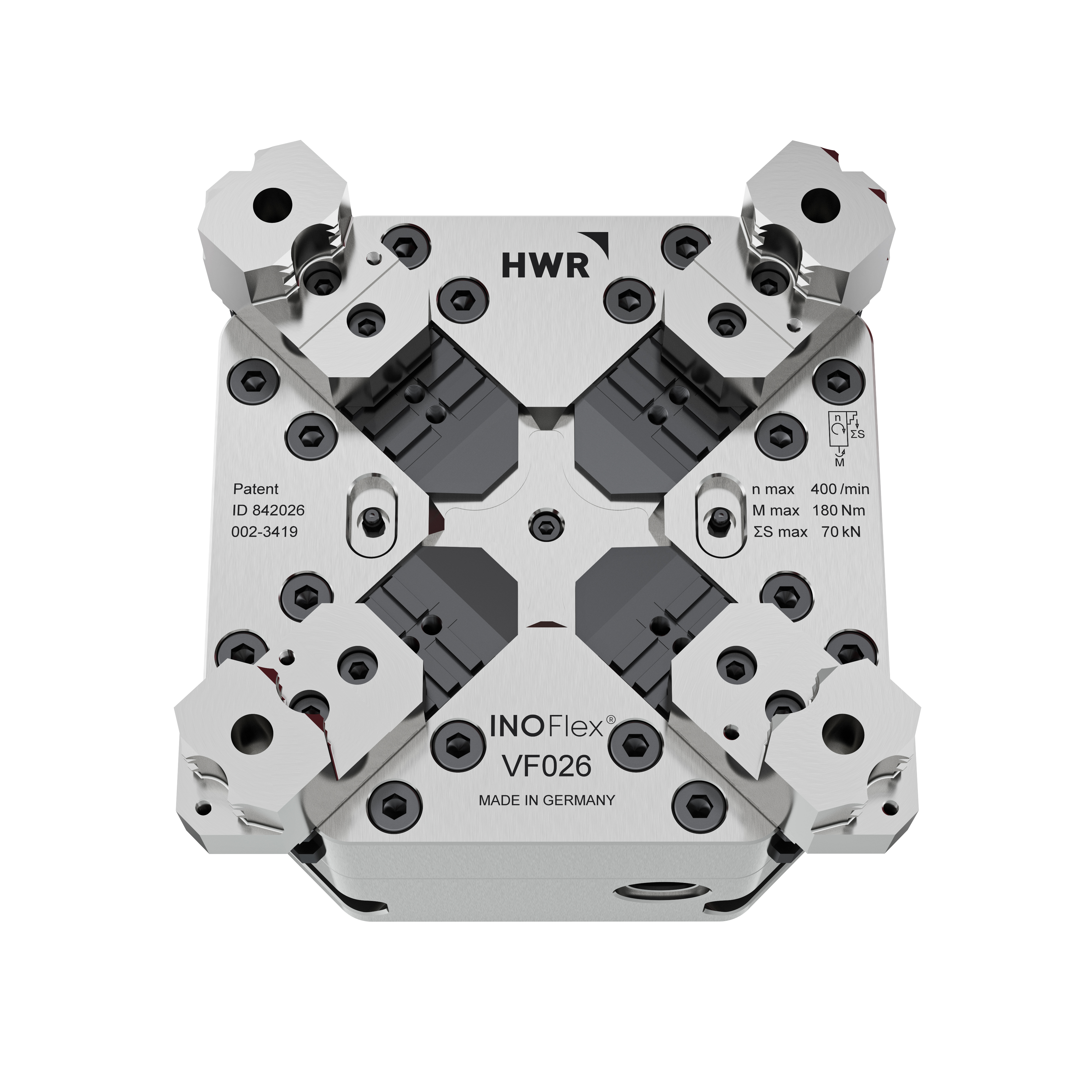 Met de InoFlex® 4-klauw klauwplaat met unieke krachtcompensatie kunnen werkstukken in ronde, rechthoekige en zelfs onregelmatig gevormde werkstukken gecentreerd worden opgespannen. Door het unieke ontwerp is de spankracht op alle vier de klauwen altijd gelijk.